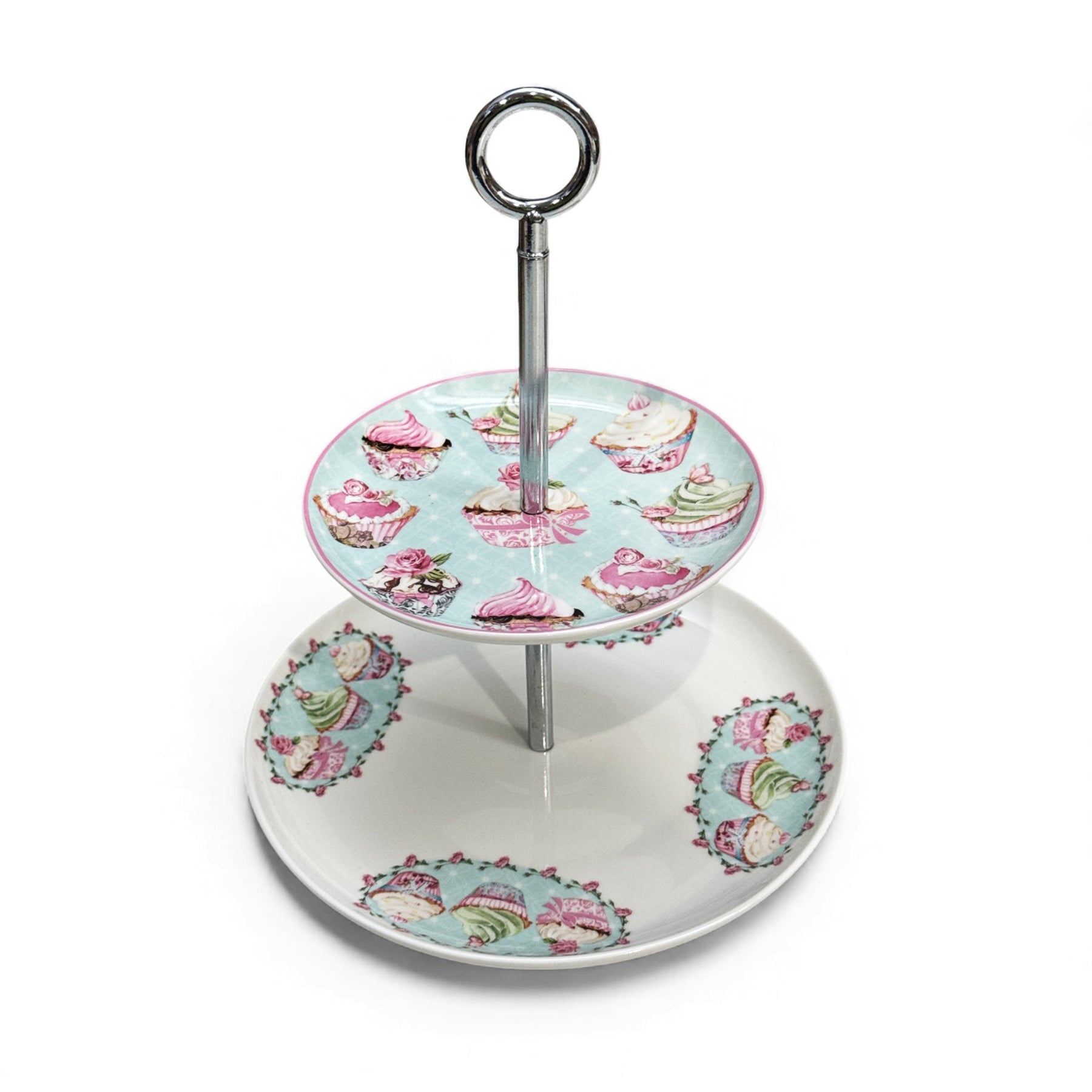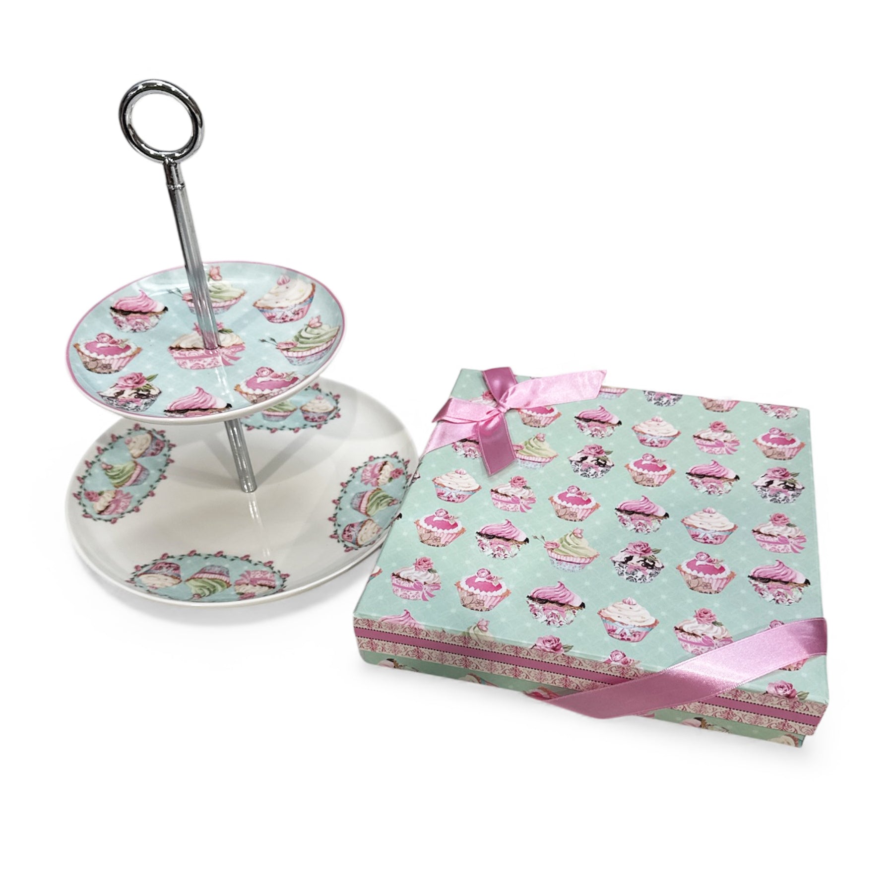 - Ceramic Cup Cake Stand, 2-tier. Comes in a beautiful gift box. Easy assembly required (instructions enclosed). Bottom/Larger Plate 225mm in diameter, Top/Smaller Plate 155mm in diameter.