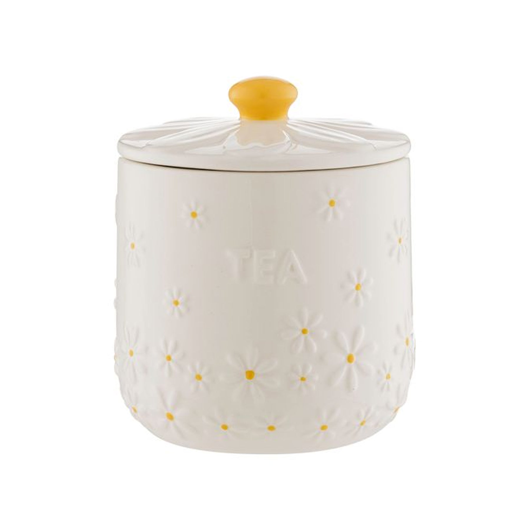 They all feature a textured, embossed finish with raised daisy flowers, making them a pleasure to look at. The lids on the tea pot and storage jar is the shape of a daisy with its yellow centre.